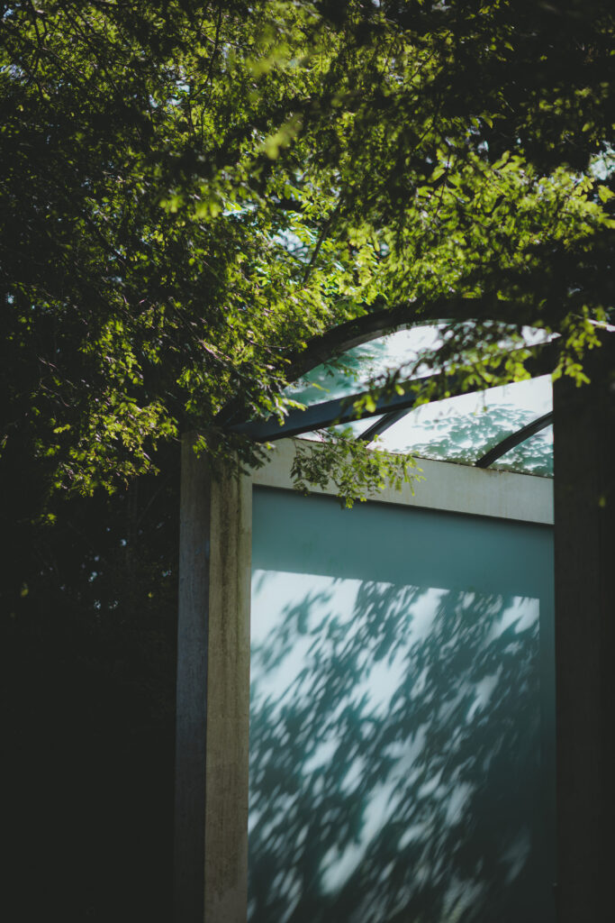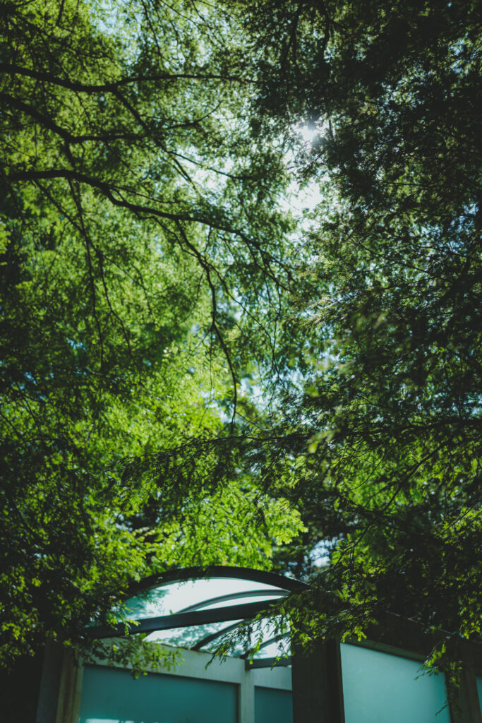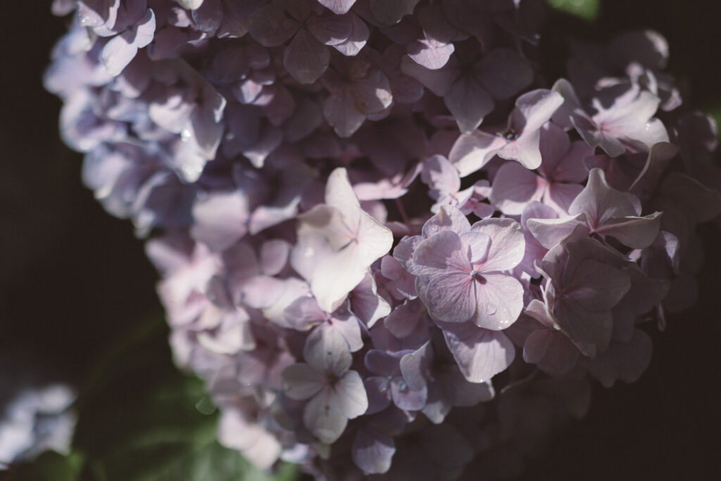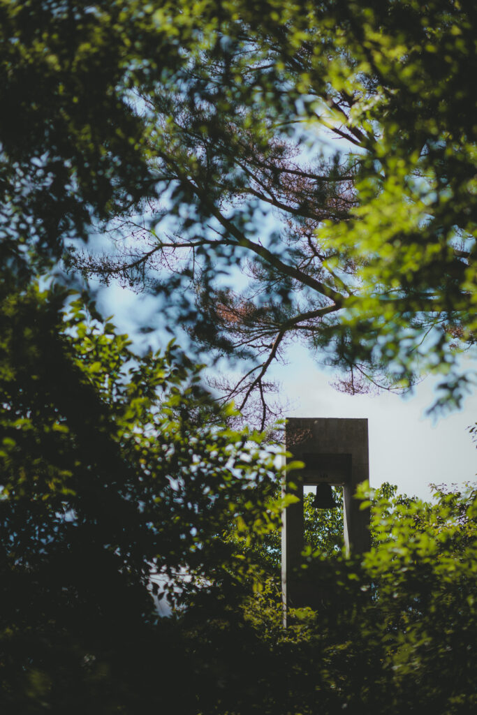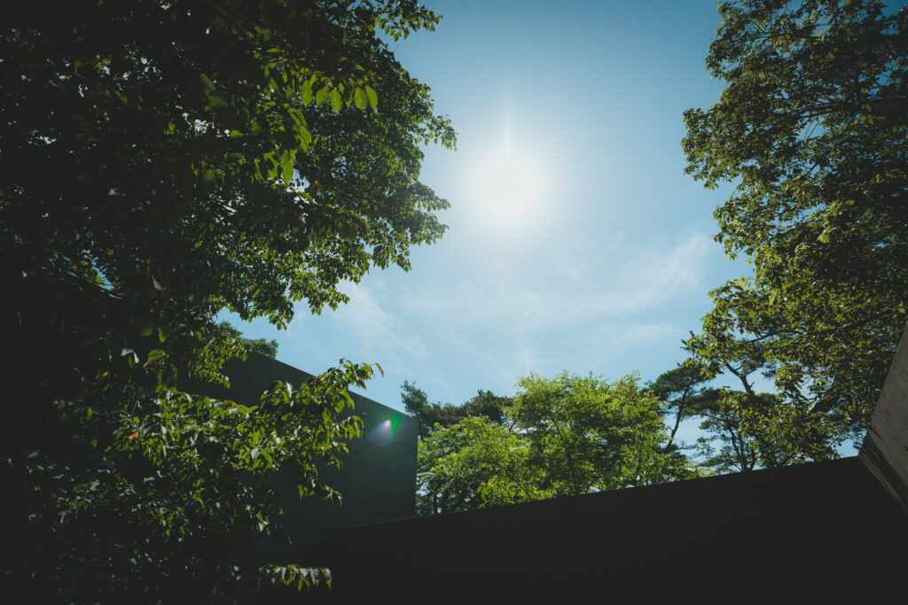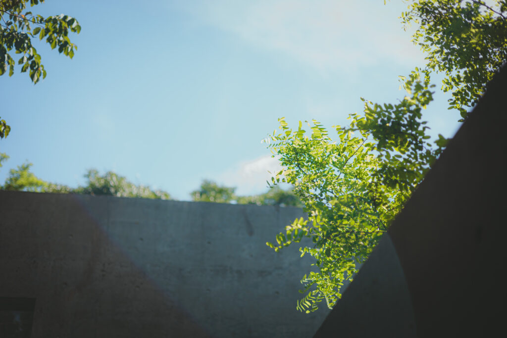 7月の風の教会周りの空や自然の葉の色は深い緑と夏の日差しで、光と影のコントラストがくっきりと映っていて美しいです。紫陽花も咲いていました。