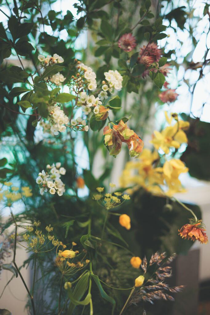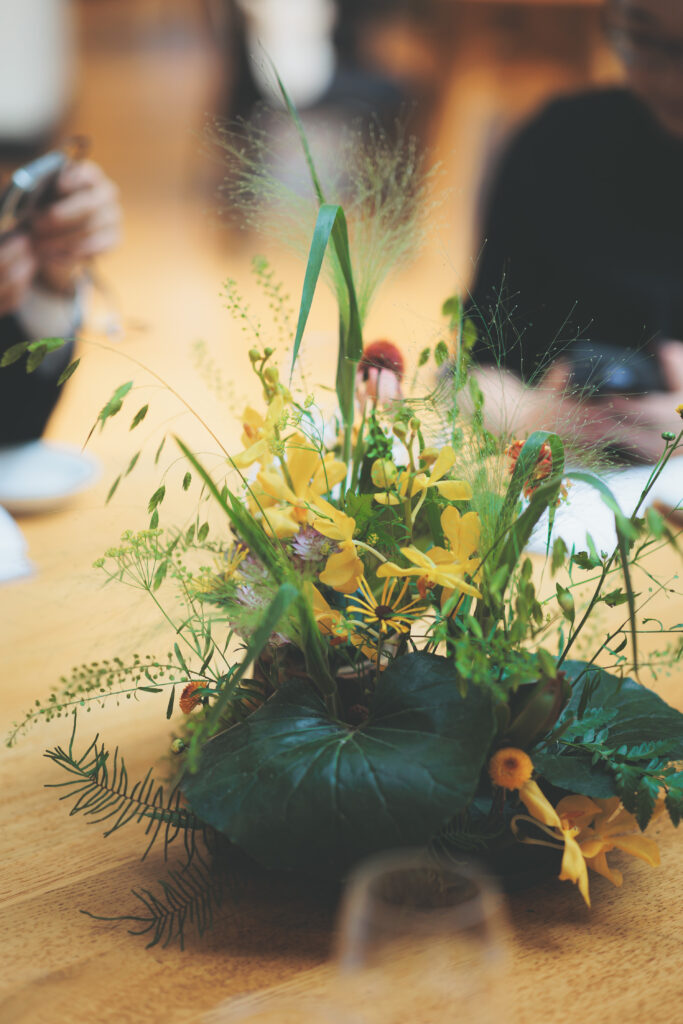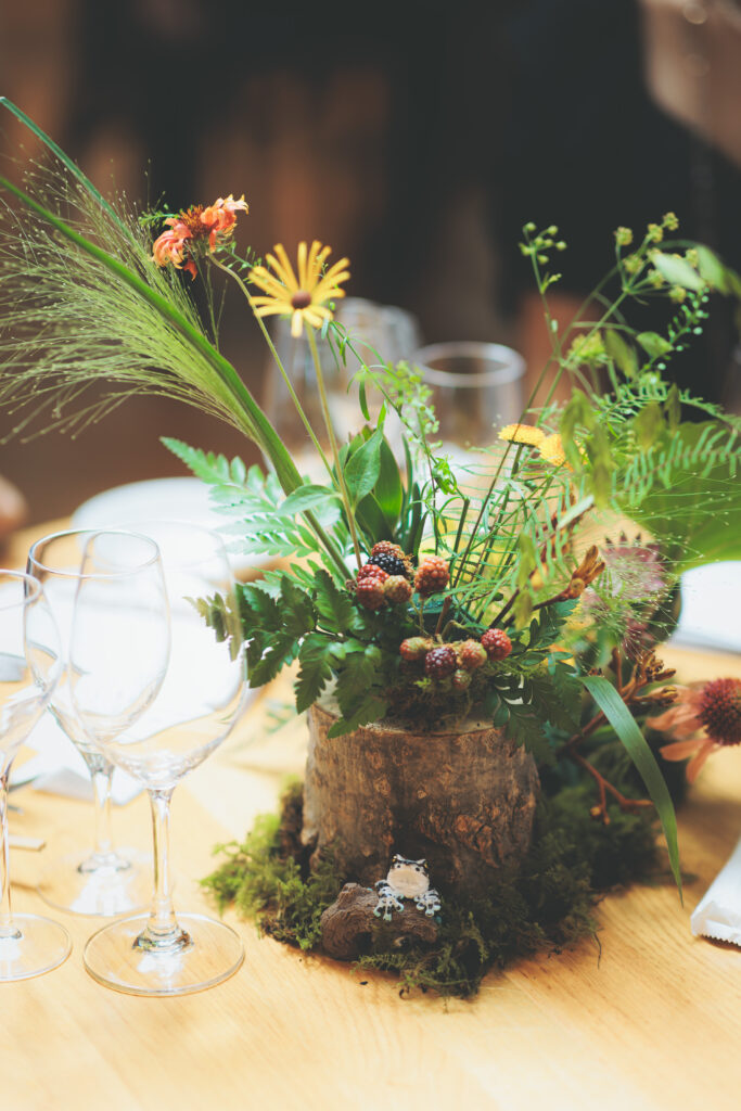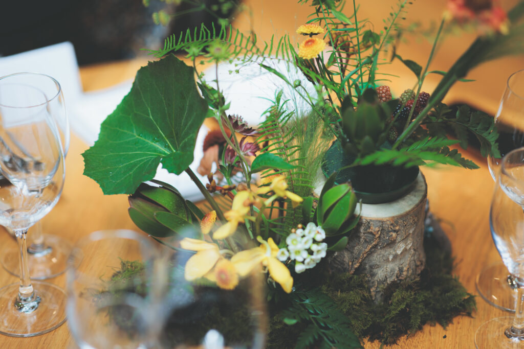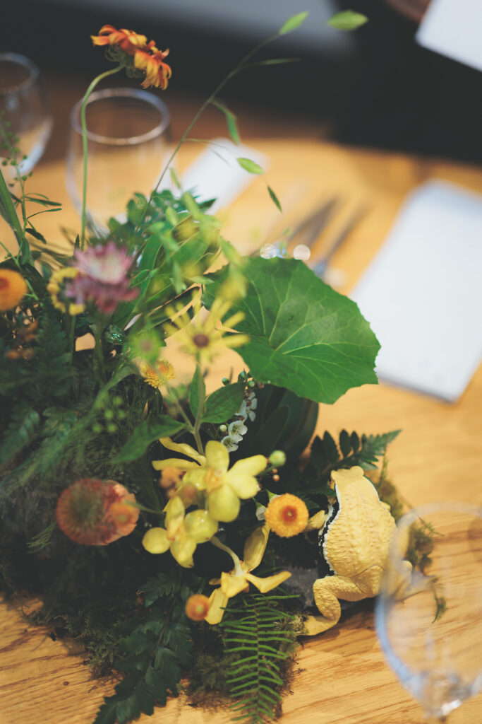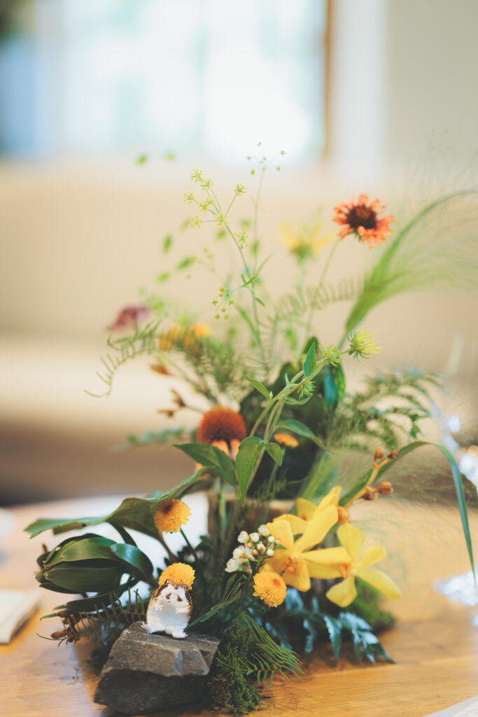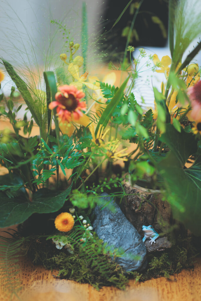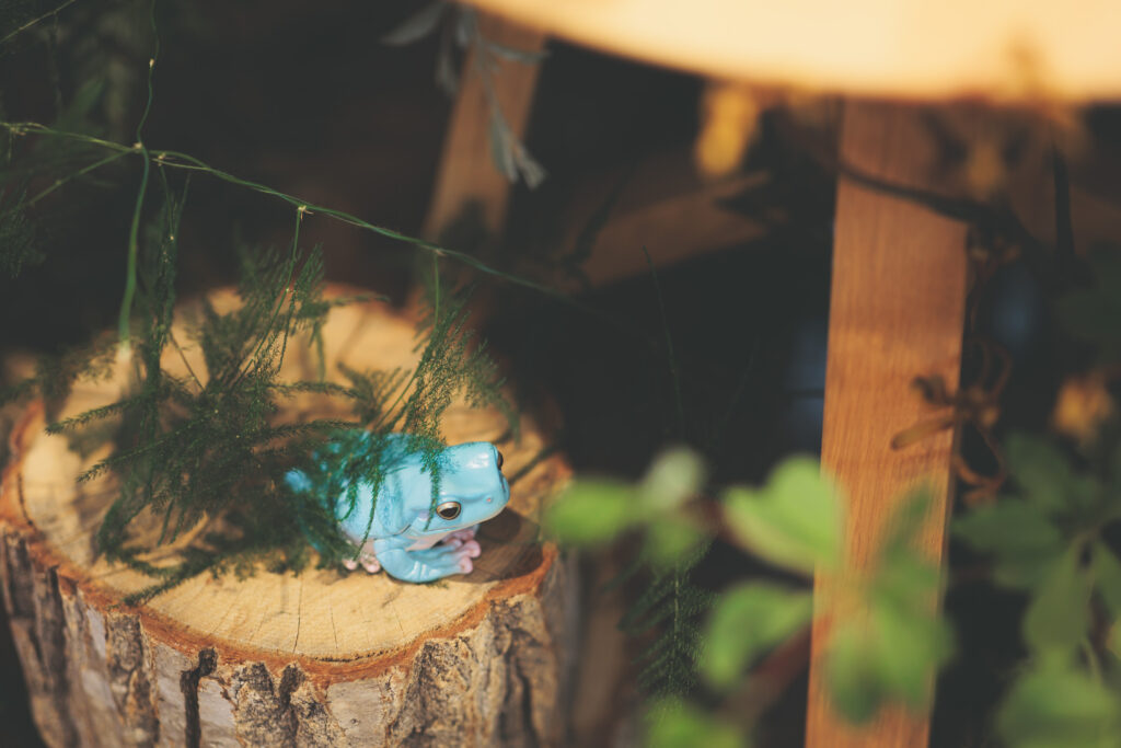 会場を彩るお花の中には、こっそり隠れカエルが潜ませて、今にもカエルが出てきそうな空間をイメージしてコーディネート致しました。