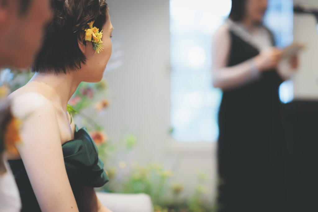 お色直し後のを再入場でお召しになられたカラードレスには、耳元から生花のイヤカフを身に着けてご登場。