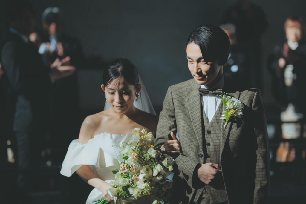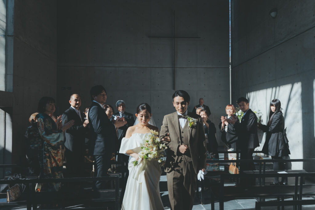 誓いを経て、ゲストの皆さまから祝福の拍手に包まれる中、温かい空気と共に退場します。