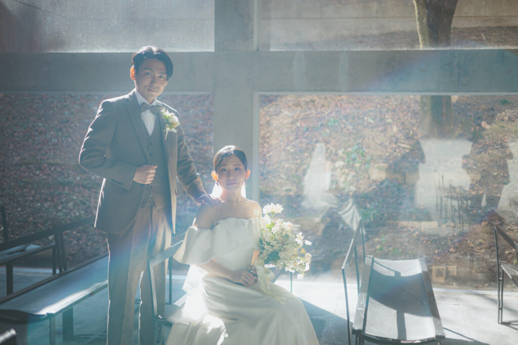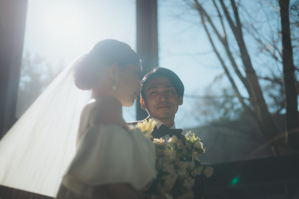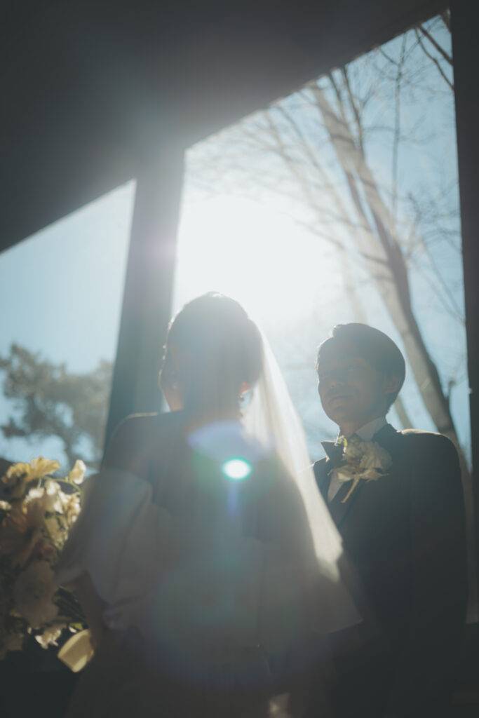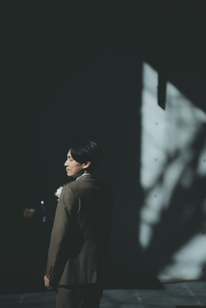 自然が導き出す光のコントラストとこの空気感の中、ご新郎様もかっこいい瞬間を記録する事が出来ますので、おふたりのソロカットも風の教会ではおススメしております。