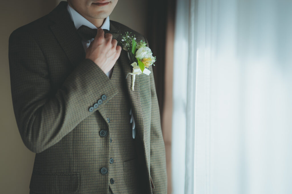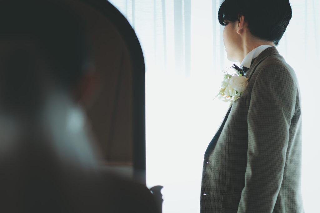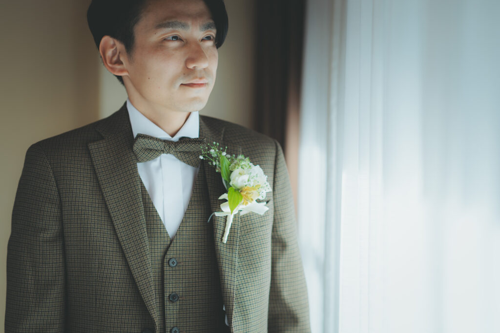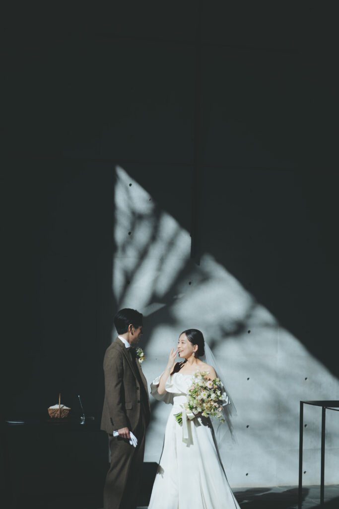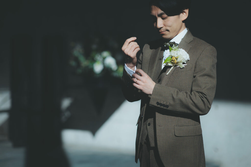 自然が導き出す光のコントラストとこの空気感の中、ご新郎様もかっこいい瞬間を記録する事が出来ますので、おふたりのソロカットも風の教会ではおススメしております。