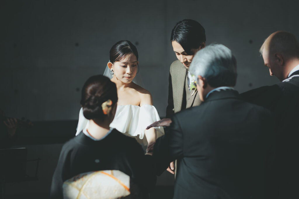 手を重ね合わせ、これからの人生を共に歩んでいく中で、互いに支えあい、家族の絆を深めます。家族との誓いの時間です。