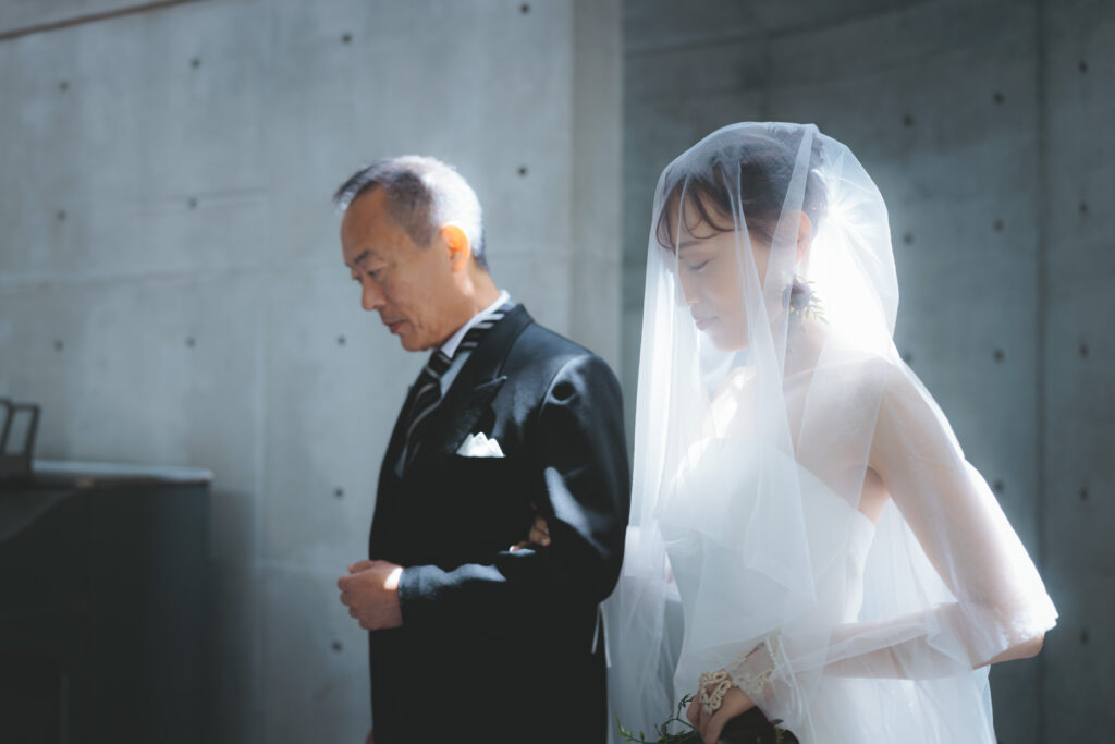教会にやわらかい光が差し込む中、お父様と歩くバージンロード。