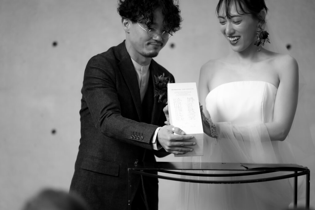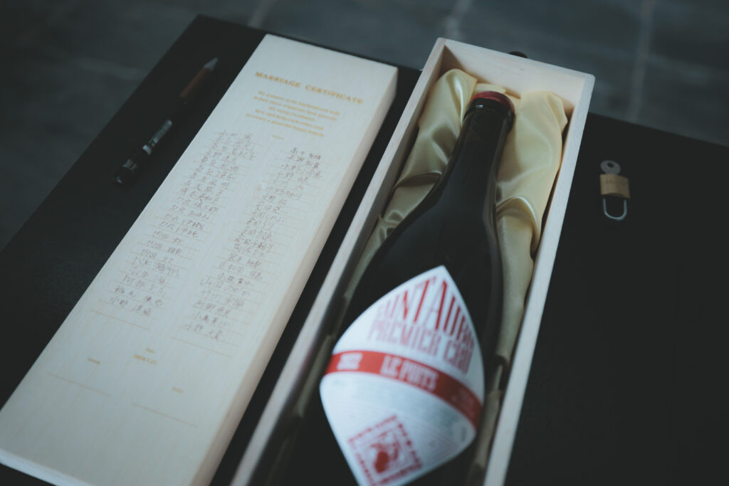 おふたりはゲストの皆さまに誓いを伝え、皆さまが結婚の証人となり、証明書としてご用意されたワインボックスへ署名をしていただきました。
