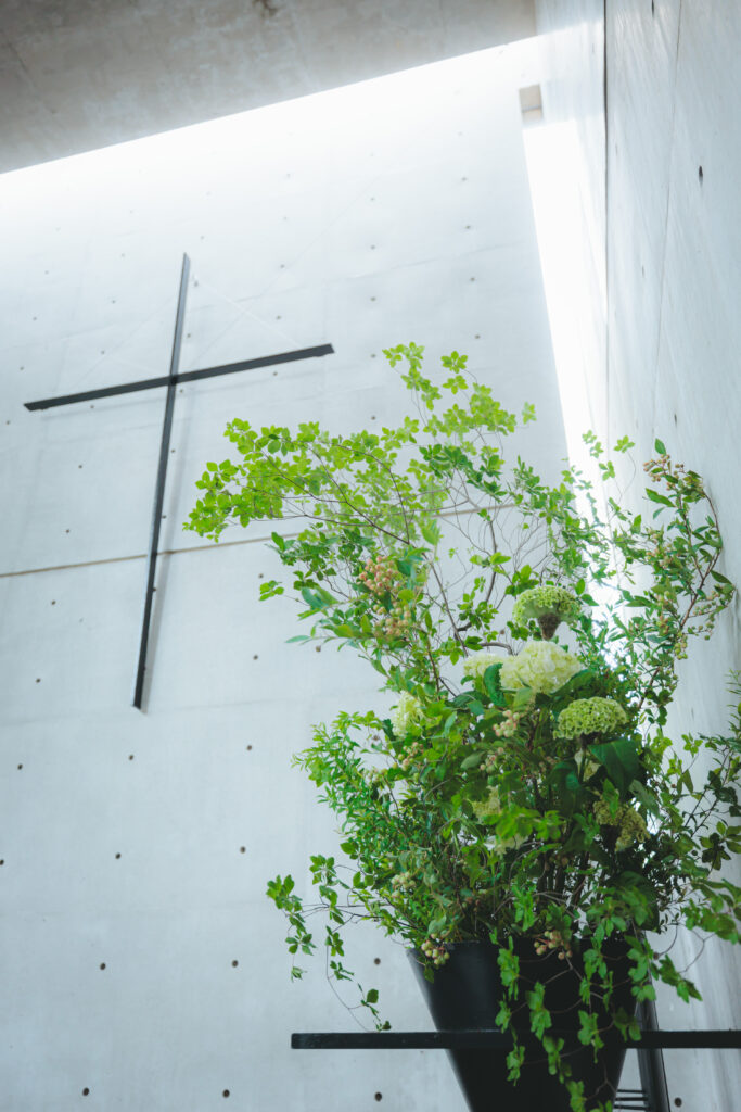 教会の中にも夏らしい緑が美しい装花をご用意しました。